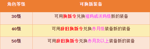2、换新令可用于以旧换新祖玛级装备,三个换新令可合成辞旧换新令;辞旧换新令可用于以旧换新赤月及以上的装备。